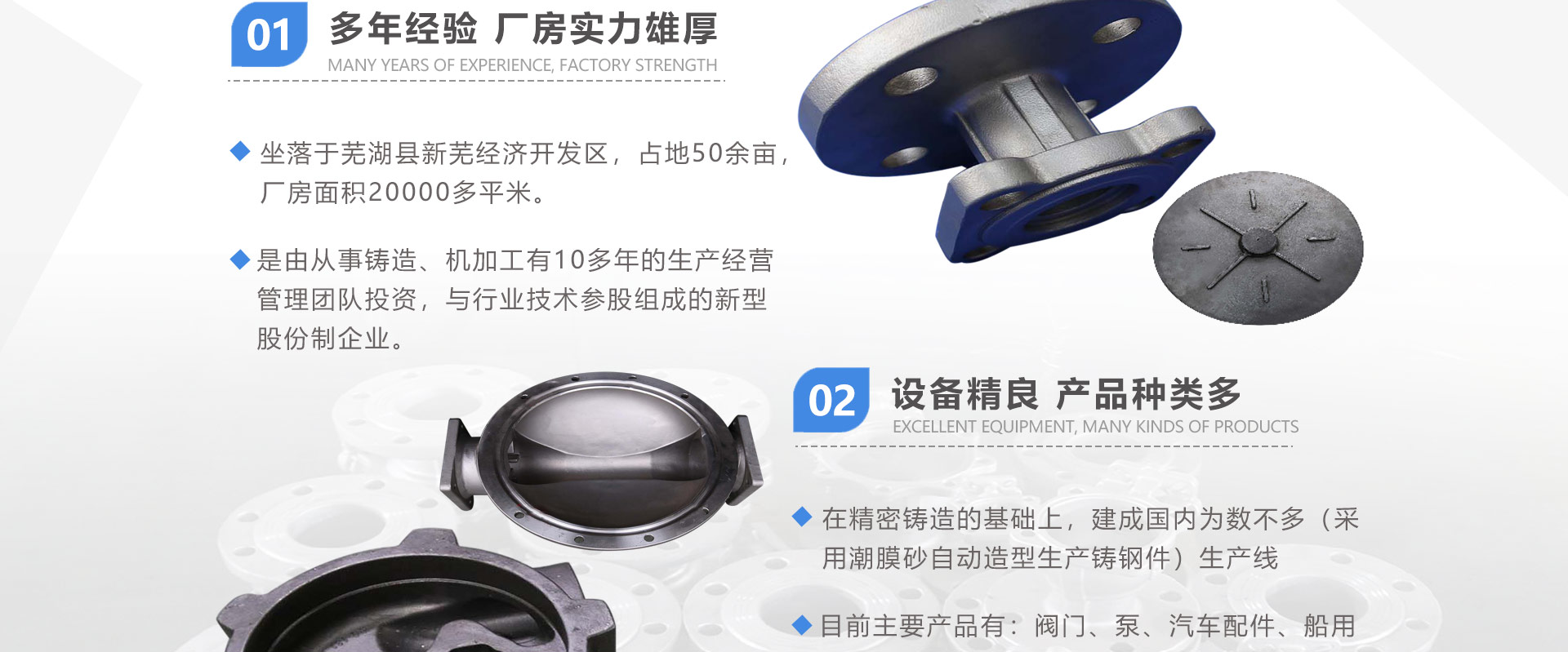 安徽偉工機械科技有限公司,坐落于安徽蕪湖新蕪經濟開發(fā)區,是一家専業從事鑄造產品設計、研發(fā)、生產、銷售于一體的企業,公司為客戶的產品提供多樣的技術支持與設計,公司主要鑄造技術有潮模砂鑄造、硅溶膠精鑄工藝。主要產品有:不銹鋼閥門配件、泵閥配件、汽車配件、工業管道配件、工程機械配件、汽車配件等。材質為:低合金鋼、304、316、316L、鉻鉬鋼、哈氏合金、碳鋼、雙相鋼等。公司已先后通過ISO9001和TS16949等多種體系審核,以完備的管理手段和齊全的檢測設備滿足客戶需求,進的設備,専業的技術,嚴謹的管理,穩(wěn)定的質量。服務客戶,鑄造未來,偉工誠摯的歡迎新老客戶共同商洽合作